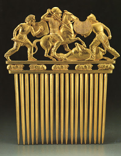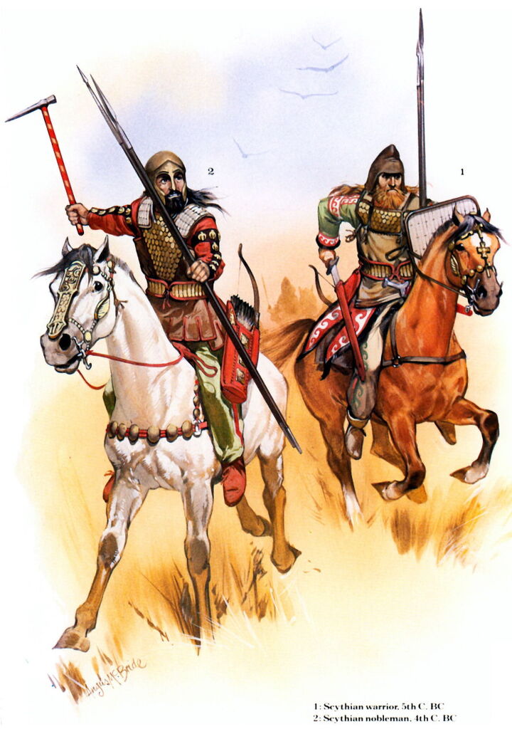 기원전 7세기부터 3세기까지 흑해와 북방의 초원을 지배했던 스키타이는 세가지 특징을 보이는 그들만의 문화를 영유했다. 이들은 아키나케스검을 사용했고 스키타이만의 특이한 마구, 재갈과 재갈멈치[鏡板]를 사용했다. 재갈멈치는 말의 입에 넣은 재갈이 빠지지 않도록 말의 뺨에 장착하는 도구다. 그리고 금이나 은으로 만들어진 여러 동물장식품을 사용하였다.