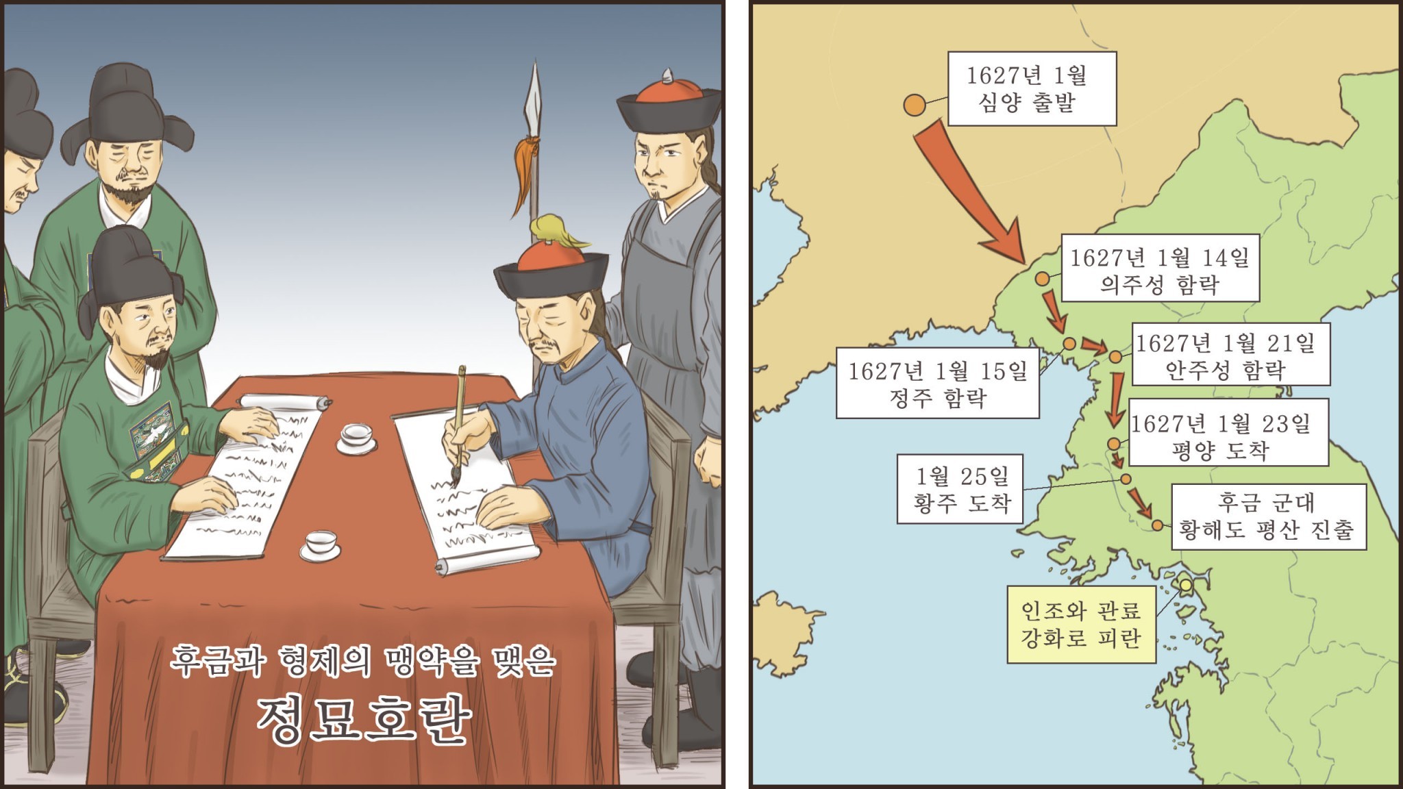 후금군이 전격적으로 조선을 침공하면서 정묘호란이 벌어지게 되었다. 1627년 1월 심양을 출발한 후금군은 1월 14일에 의주를 함락했다. 후금군이 기동력을 살려 빠르게 남하하자 인조는 소현세자는 전주로, 자신은 강화로 피난하였다. 평안도에서는 후금군이 지나가자 정봉수와 이립 등이 의병을 일으켜 후금의 배후를 공격하자 이들은 배후가 차단될 것을 염려하여 평산에서 더 이상 남하하지 않았다. 이에 조선 조정도 후금군의 강화도 접근에 위협을 느껴 주화론을 채택하고 양측 모두 협상에 들어갔다. 조선과 후금은 형제의 맹약을 맺고 후금은 군대를 철군하였다. 그러나 후금은 조선에게 군신의 예를 요구했고, 공물과 정병 3만을 요구했다. 이러한 후금의 요구로 인해 조선에서는 척화배금의 여론이 일어났다.