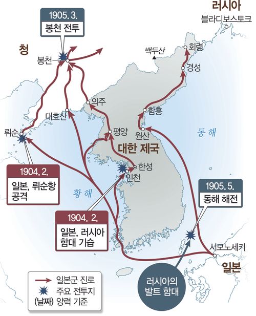그러나 러시아 함대는 영국의 견제로 인해 지구를 한바퀴 돌아 동해로 들어왔다. 일본군은 거의 6개월만에 발트해에서 대한해협까지 왔으나, 일본 해군에 의해 패배하게 되었다. 일본은 전장에서 매우 가까운 곳에 있었고, 중립을 선언한 대한제국에 한일의정서를 강요하여 요충지를 선점하였다. 영국도 일본에 군비를 저금리로 지원해 승리를 도왔다. 결국 일본과 러시아는 1905년 9월 포츠머스 조약을 체결하고 전쟁을 마무리하였다. 일본은 대한제국에 대한 지도와 보호, 요동에 대한 조차권과 철도 부설권을 인정 받았다. 이보다 조금 앞선 1905년 7월에는 미국도 일본과 비밀 협정을 맺어 필리핀 점유권을 인정받고, 일본의 대한제국 지배를 승인했다. 일본은 결국 러시아와 청을 모두 배제하고 한반도에 대한 독점적 지배권을 확립하고 남만주 진출을 국제적으로 인정받았다. 물론 중국의 의견은 중요하지 않았다.